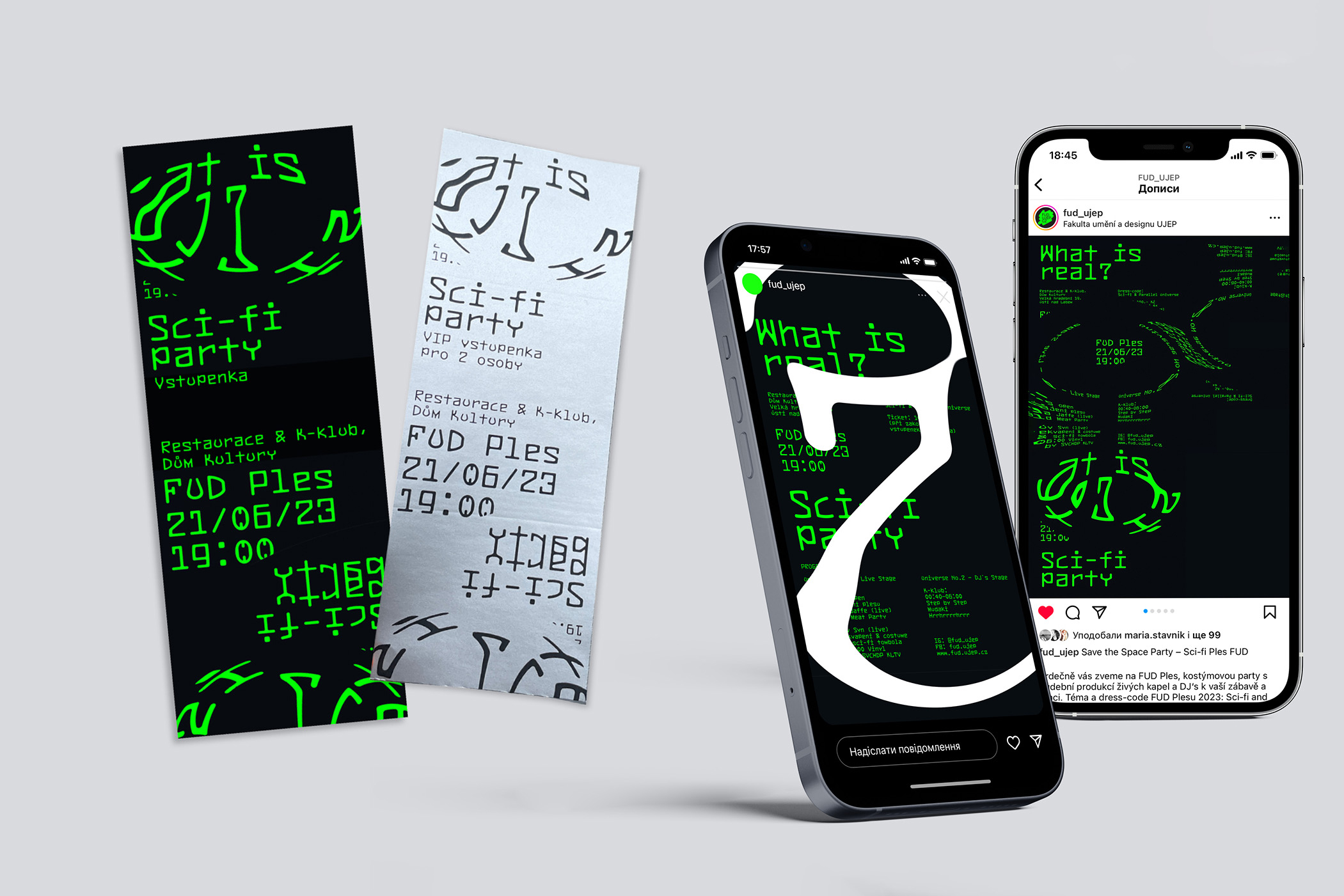 Návrh vizuálního stylu akce ples FUD 2023 na téma Sci-fi & Parallel Universe. Hlavním grafickým prvkem je typografie, která svou proměnou tvoři vizuální systém použitý v návrhu identity udalosti.